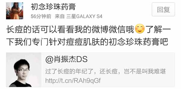 PS:發布了這條微博,大家可以看到,56分鐘的時候,收到一條評論,這妹子,可真的是很專業、而且很簡單的技巧,就給我推薦了一款去痘產品,當然這樣的營銷,效果怎么樣?據統計,轉化率都可以達80%左右。